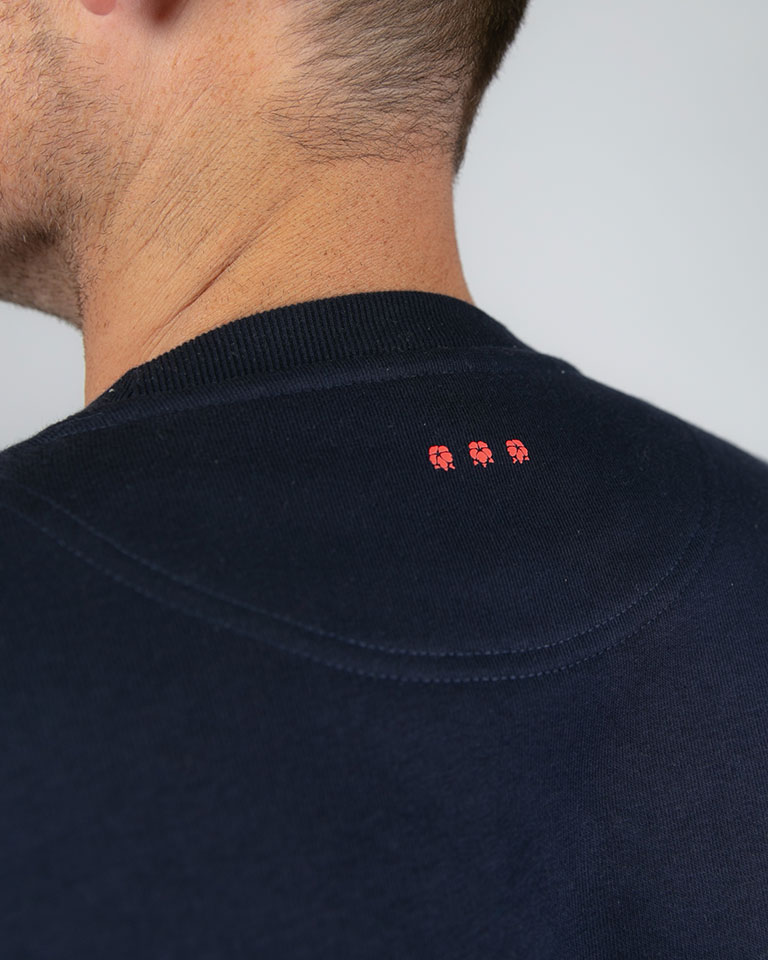 Comfortabele pasvorm (350gram p.m2) 85% biologisch katoen en 15% gerecycled polyester Stevige stof J54 detail